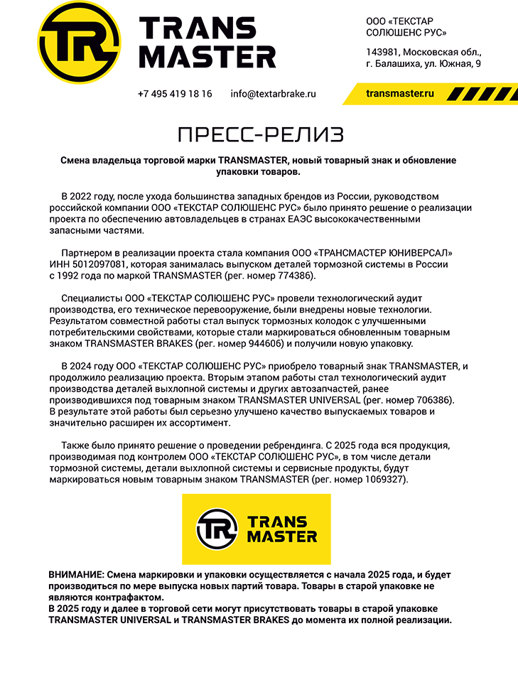 ПРЕСС-РЕЛИЗ TRANSMASTER: смена владельца ТМ, новый ТЗ и обновление упаковки